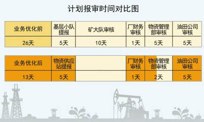 以统一计划为例,这个厂将以往全厂所有基层小队按月提交计划逐级申报审核、统计上报到大庆油田公司的5个流程节点,缩减为厂物资供应站统一制订年度计划逐级审核上报到油田公司的4个流程点。计划流程优化后,操作人员由矿(大队)26人减少到厂级2人,审批周期由23天减少到10天,报审效率提高56.5%。