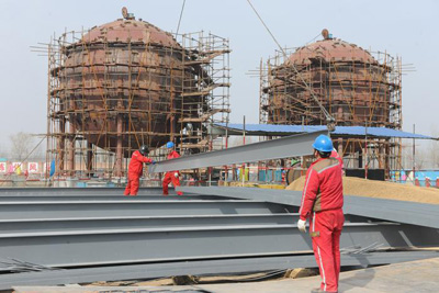图为3月2日,中原油建工程有限公司施工人员正在进行土建工程施工