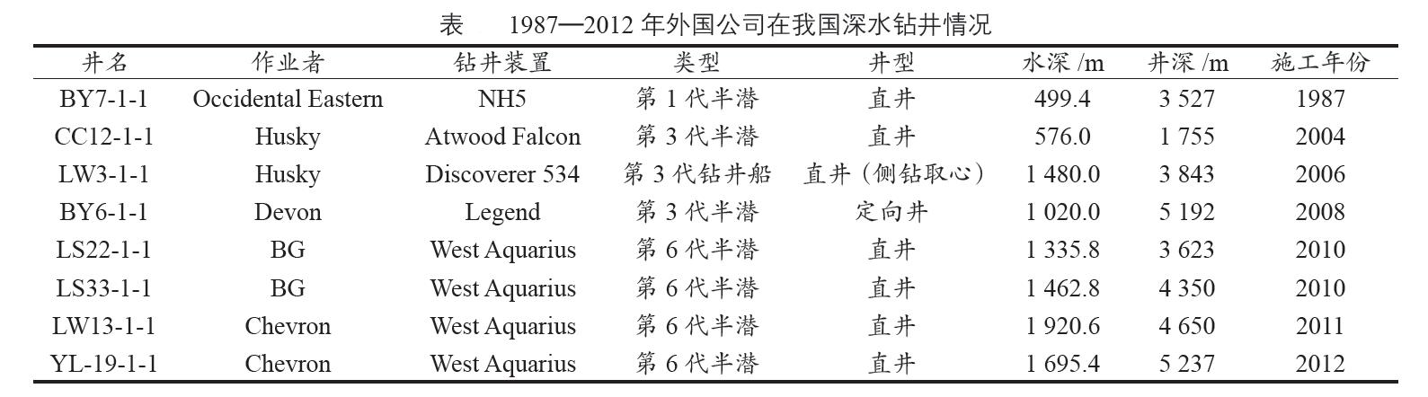(1)钻井数量少、学习机会少。1987—2012年的25年时间,共计钻深水井8口,这充分体现了深水井高投入高风险,工作量远远小于浅水;从另一个侧面也说明了学习和了解更多的国外深水知识和技术的机会来之不易。