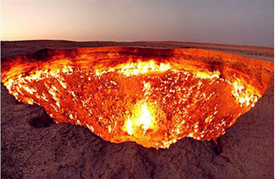 1971年苏联地质学家进行钻探时,意外发现了一个充满天然气的地下洞穴。钻探设备下的一片泥土倒塌,留下一個直徑約50~100米的大洞。為了防止有毒气体外洩,他們決定点燃漏出來的天然氣。截至今日,洞口的火焰從未间断過。当地人称之為“地獄之門”。“地獄之門”是直径约为70米的大坑,至少燃烧了40多年。