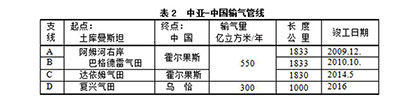 中亚—中国管线(CentralAsia–Chinagaspipeline)由中国石油(PetroChina)与土库曼斯坦天然气公司(Türkmengaz)、哈萨克斯坦国家石油天然气公司(KazMunayGas)及乌兹别克斯坦天然气公司(Uzbekneftegaz)联合组建。中亚输往中国的有四条支线—A、B、C、D,见表2。起点都在土库曼斯坦,经过乌兹别克斯坦和哈萨克斯坦抵达中国边境霍尔果斯(huoergusi),或者经过乌兹别克斯坦、塔吉克斯坦和吉尔吉斯斯坦抵达中国边境乌恰(Wuqia)。2016年后涌往这条丝绸之路的天然气最高可达年输850亿立方米。如果计算从土库曼斯坦到上海,管线长达6000公里以上,可称世界最长的管线。