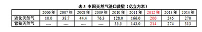 1969年美国基奈(Kenai)LNG工厂的产品首次输往日本,供东京电力公司和东京燃气公司使用,可是我国到2006年才开始进口LNG,足足晚了37年,但在中国仍然是LNG先入为主,所以人们一谈起天然气进口,首先想到LNG,我国于2010年开始进口管输天然气。从中亚进口天然气发展很快,2012年就首超LNG,见表3。