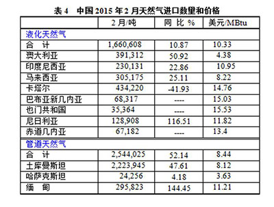研究能源必须研究能源数据,做个简单的计算,情况就明朗了。我们选最新的2015年2月份中国天然气进口数据,见表4。(1吨天然气≈1360立方米)