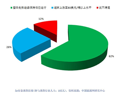 (1)尽管目前低油形势何时结束存在争议,但业内专家普遍预计,国际原油价格在2015年继续颓势的可能性较大。中国能源网研究中心针对2015年国际油价走势进行的调查问卷也支持同样的观点,调研结果如下图所示:
