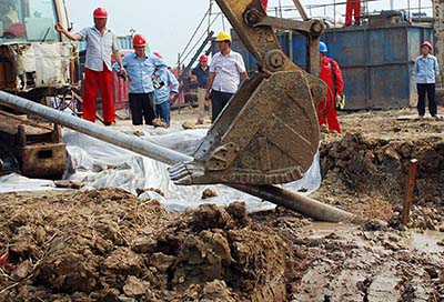 5月26日,伴随着机器的轰鸣和鞭炮声,位于湖北省黄冈市境内的仪长复线黄梅至九江段龙感湖支流水平定向钻穿越工程正式开工。该工程穿越水平长度1759.9米,最大穿越深度12.55米。 图为300吨水平定向钻机在龙感湖支流南侧定点入土。