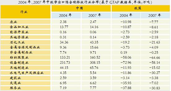 在对各国投入产出表、贸易数据和能耗、碳排放等数据进行一致性调整,使货币单位、投入产出总值和贸易关系实现较好对接的基础上,我们对2004年和2007年中欧碳排放数据进行计算分析,发现在这两个年份,中国出口隐含碳排放均大大高于同期进口隐含碳排放,是贸易隐含碳排放的净出口国。从变化趋势上看,2004年至2007年中国净出口隐含碳排放增加了1.45亿吨,增幅高达29.15%,且净出口隐含碳排放在国内碳排放总量中的比重有所增加。