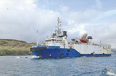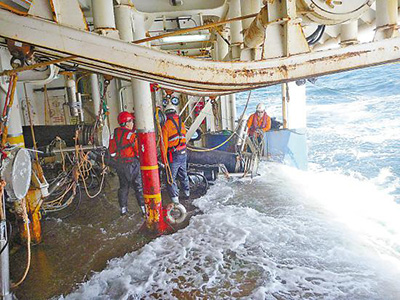 又一个大浪扑上BGPExplorer物探船甲板。8月的爱尔兰海域水温为10至15摄氏度。浸泡在海水里,超过30分钟就让人难以忍受。然而物探船上收气爆震源枪的员工一次收枪收缆必须连续工作约1个小时。