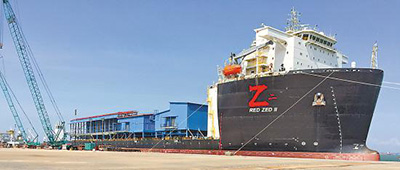图为在码头上准备起航的变电站模块运输船。
