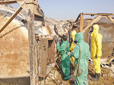 这次抢险的主要任务是在装有不明物体且没有发生泄漏的集装箱上粘接2英寸短节,待达到一定粘接强度后,进行密闭开孔,然后由生化部队对箱内物品采样化验,对确认没有危害物品的集装箱进行破拆,一旦发现危害品,立即进行注氮隔离。