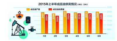 受国际原油价格影响,今年上半年国内成品油价格“五涨四跌三搁浅”,相较于去年6月至今年6月汽、柴油分别下调1747元/吨和1975元/吨而言,总体呈微幅上涨,总计汽油和柴油分别累计上调460元/吨和385元/吨。国际油价在3月中旬跌至6年来的历史低位43.46美元/桶,尽管第二季度反弹幅度高达30%,但由于伊朗核问题协议达成、希腊债务危机等原因,导致石油供需格局并没有发生有效转变,油价也不具备大幅上涨的动力。预计下半年布伦特国际油价仍将维持在45~75美元的水平。因此,国际原油价格仍将保持低位震荡,国内成品油价仍有下跌可能。