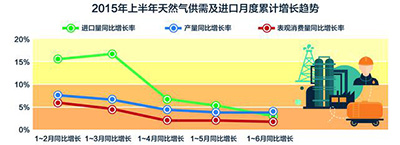 数据显示,今年上半年天然气进口量为293亿立方米,增长3.5%。一季度,天然气进口量约160亿立方米,主要为管道气和LNG进口,分别为93亿立方米和68亿立方米,同比增长16.5%。但由于二季度天然气进口量锐减,导致上半年天然气进口量同比增幅降至3.5%,比2014年12.6%的增幅下跌约9个百分点。