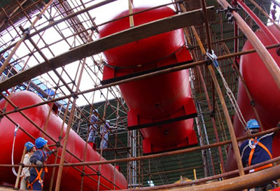 图为热电部工作人员正在吊装新储罐。