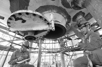 近日,江苏油田能源环境处特种设备检验检测所工作人员在扬州石化检测液化气球形储罐。据悉,该检测所2014年取得了国家级球形储罐检验资质,这是他们首次承接球形储罐检测任务,检验项目包括宏观检验、壁厚测定、表面缺陷检测、埋藏缺陷检测、硬度检验、气密性试验等。范友林摄