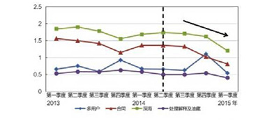 物探作为油气勘探的眼睛和前哨战,始终在油气勘探开发中发挥着重要作用。在这场油价的浩劫中,物探行业同样饱受重创,主要体现在:①物探市场萎缩、公司利润下滑。石油公司为了降低供应商成本,压低物探产品和服务的价格,物探行业的利润空间被进一步压缩。多家物探公司净利润为负值,陷入亏损。其中全球最大的综合物探公司CGG净利润波动最为剧烈,2014年末净利润为-6.67亿美元。与2013年、2014年一季度相比,2015年一季度物探公司的净利润仍在明显下滑,多数物探公司持续亏损(见图1)。