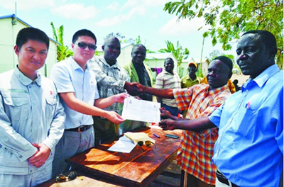 管道局代表将营地捐赠文件交到当地政府官员代表手中。