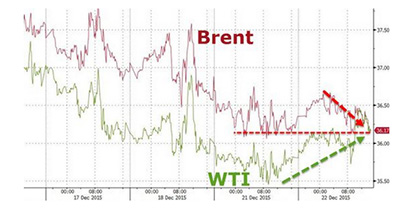 [新华网2015-12-23]WTI2月原油期货价格在连跌五日后终于迎来上涨,收涨0.9%,报每桶36.14美元。自今年1月以来首次高于布油价格。布伦特原油期货在盘中触及11年来新低的每桶35.98美元之后,最终收跌0.7%,报每桶36.11美元。