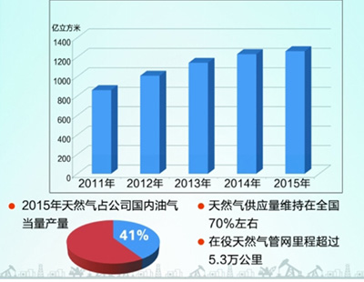 天然气作为清洁优质能源,是现阶段我国调整能源结构、防治大气污染最现实的选择。中国石油历来高度重视天然气业务发展,将其确定为成长性、战略性、价值性工程,持续提升天然气生产和供应能力。“十二五”期间,天然气供应量年均增长111亿立方米,占全国天然气供应量比重保持在70%左右。