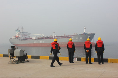 图为2.5万吨级的“长兴洲”号油轮缓缓靠岸。