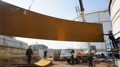 图为施工人员吊装罐体围板。赵钰曹曦摄