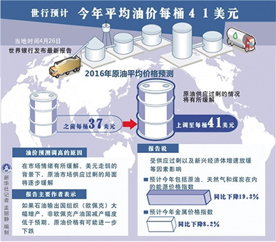 “预计今年市场在经历一段时间的供应过剩之后会重新恢复平衡,随之能源类大宗商品价格将会小幅上升。”世界银行高级经济学家、《大宗商品市场前景》报告主要作者约翰·巴菲斯则表示:“如果石油输出国组织(欧佩克)大幅增产,且非欧佩克国家减产速度低于预期,能源价格就有可能进一步下跌。”目前,在伊拉克和尼日利亚原油生产中断和非欧佩克国家(主要是美国)页岩油减产之后,4月份原油价格从1月中旬每桶25美元的低点回弹至每桶40美元。不过,在4月中旬的会议上关于主要产油国冻结产量的提议未能实现。