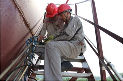图为仪表专业人员正在安装罐体配套线缆。赵钰赵彦摄影报道
