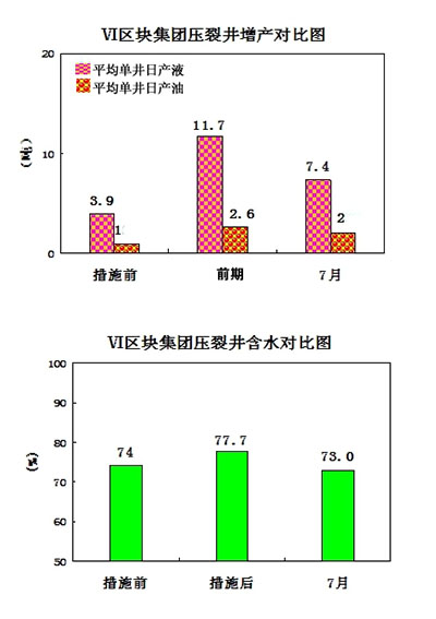 今年4月,在前期大量技术研究支撑下,从设计到试验完成,利用不到一个月时间,完成了VI区块17口油水井的集团压裂试验。其中油井16口、水井1口,压裂后马上见到效果。对比同地区同规模常规生产组织方式,集团压裂的效率提高5倍,累计节省资金234.5万元。这种针对老井的大规模集团式压裂方法,在整个集团公司尚属首例。