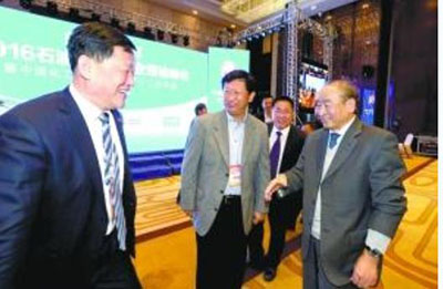 图为中国石化联合会会长李寿生在领袖峰会上与代表互动交流。(摄影张育)