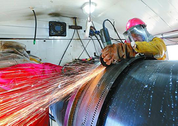 员工在打磨焊口。