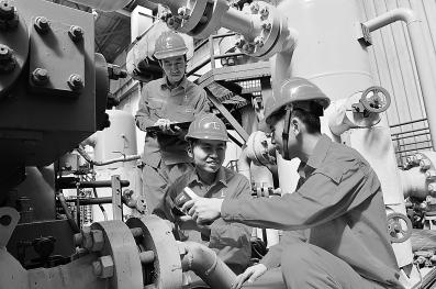 中原文96储气库是中国石化首座地下储气库。中原油田天然气产销厂作为运营单位,不断强化安全和井控管理,严格执行“三级验漏”制度,确保现场安全平稳运行。图为文96项目部技术人员在注采站巡检。仝江 摄 杜燕涛 文