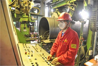 宝鸡钢管预精焊生产车间员工正在进行钢管成型操作。樊红智 摄