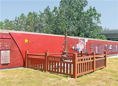 图为加油站的红色主题雕塑和展板。
