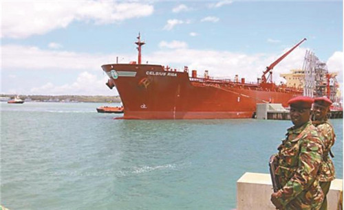 安全人员在载有肯尼亚出口原油的油轮附近警戒。
