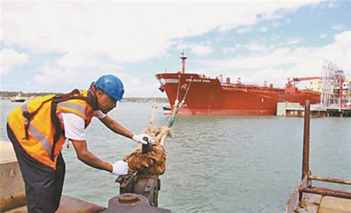 一名港口工作人员为载有肯尼亚出口原油的油轮解开缆绳。