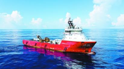 日前,上海海洋石油局勘探313轮完成长达220公里的海底管线巡检任务,取得了今年以来ROV水下机器人作业“开门红”。本次作业主要是为7棵海底采油树做投产前检测,作业期间船员们凭借过硬技术成功化解ROV水下机器人无动力回收难题,并克服高温、夜晚作业、工期紧张等不利因素,比原计划提前11天完成巡检任务。图为搭载ROV水下机器人操作平台的勘探313轮。