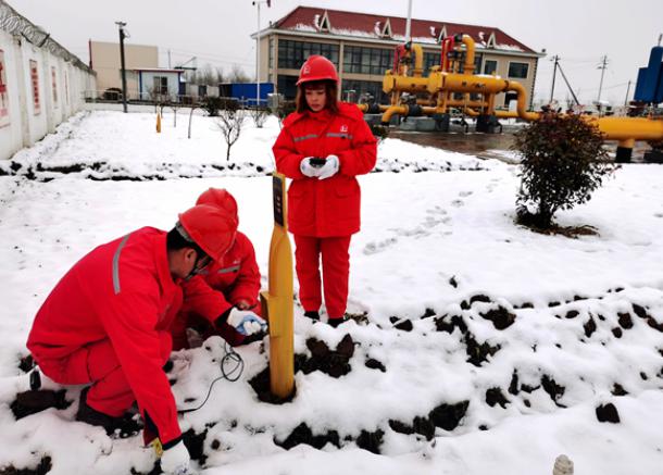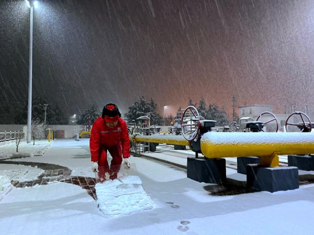 图为2月25日凌晨,山东济南地区降下了2021年的第一场瑞雪,天然气分公司山东管道公司一线员工在雪中巡检输气设备。