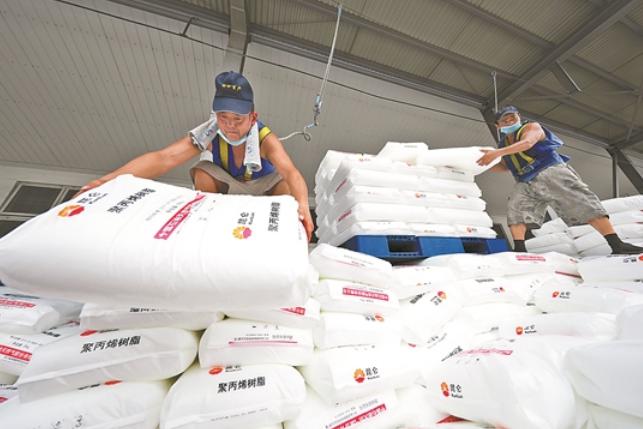 图为固体产品库房,高端聚丙烯产品在连续出库。(单忠健王春华摄影报道)
