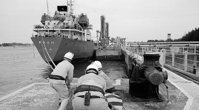 6月以来,茂名石化港口分部认真贯彻落实集团公司“不安全不生产、不安全不施工、不安全不开工”要求,全力做好疫情防控和成品油装卸船工作。6月,码头累计装卸船超100艘,成品油及化工品吞吐量近40万吨。图为6月28日码头操作工为靠泊油轮进行带缆作业。