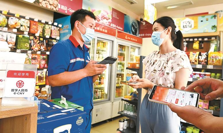 图为8月5日,顾客在东大桥加油站通过数字人民币进行商品结算