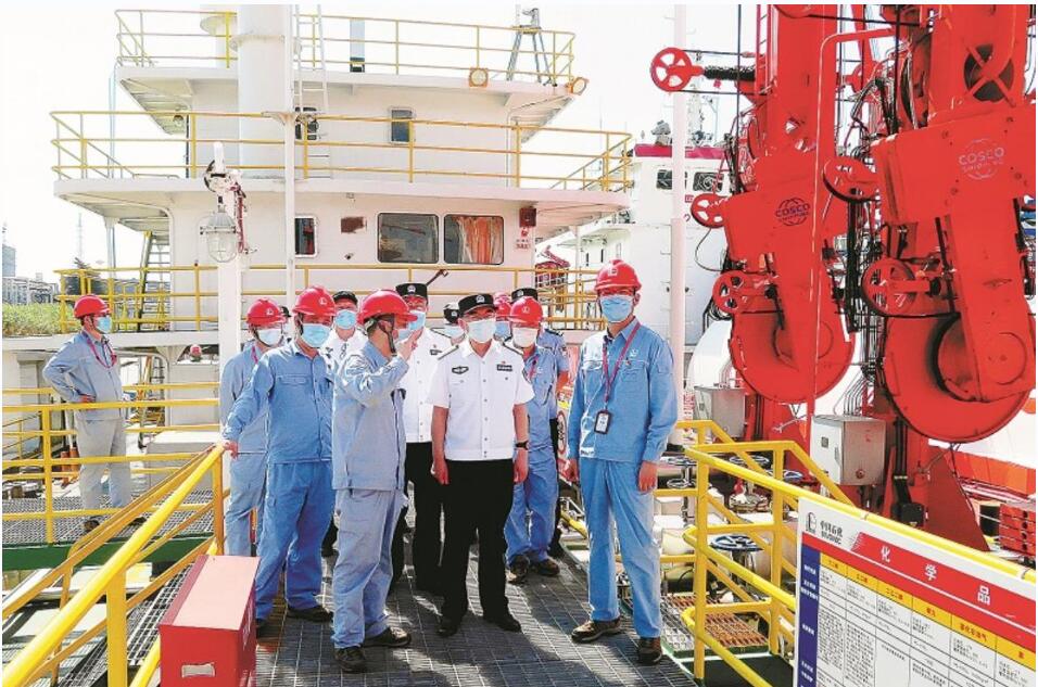 中国石化新闻网讯扬子石化码头强化涉外船舶和人员管理,根据海事部门要求,暂时对涉外船只进行停航,对明确需要进入码头作业的涉外船只,成立涉外专班,提升防控等级,所有涉外作业由专班专办。图为8月8日,南京市江北新区涉外联防联控指挥部检查组检查扬子石化码头疫情防控工作,肯定了扬子石化的防疫措施。(李维摄)