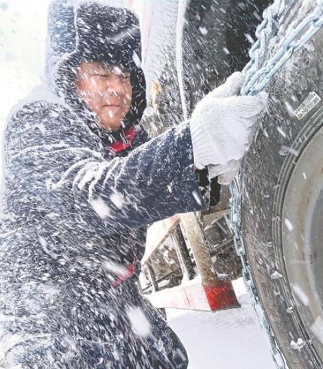 运输公司李鹏不畏严寒,正在给车辆安装防滑链。