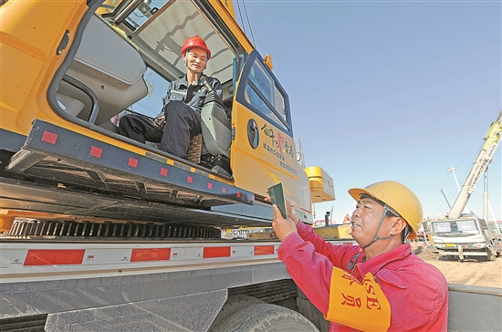 强化工程安全管控,安全员检查吊车司机特种作业证件。