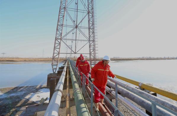 2021年12月30日,在冀东油田高尚堡油区的青龙河跨越管桥上,冀东油田油气集输公司管道分公司员工冒着严寒开展油气水管线的维护保养和隐患排查,全力保障原油和天然气的安全输送。油气集输公司管道分公司员工坚持“平安、绿色、和谐”的管理理念,严格落实和执行各项管道巡护制度,及时发现和处理问题,保证了油田油气水主干管道的安全平稳运行。