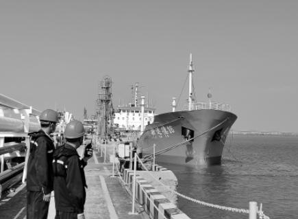 元旦期间,海南三亚机场航煤告急。茂名石化港口分部迅速协调全力保供航煤7800吨。该分部员工优化操作,提高港口成品油码头作业效率,共装卸油轮19艘,吞吐量37000多吨。图为1月3日,员工在装卸船现场忙碌。