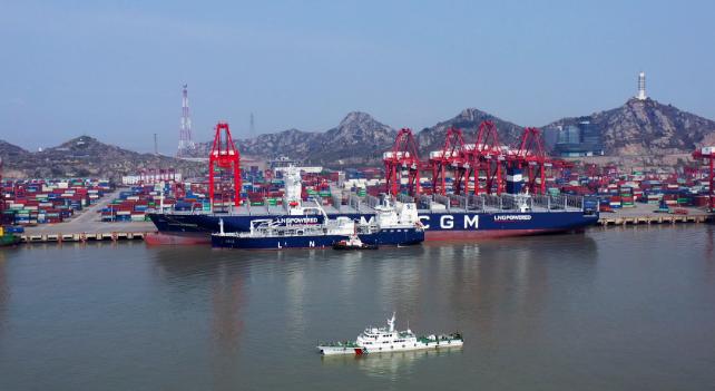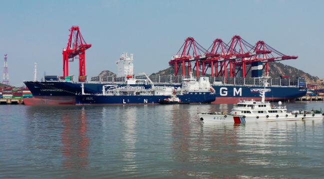 中国首单!洋山港完成大型双燃料集装箱船LNG船-船同步加注(图)