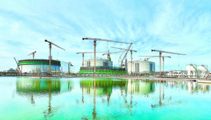 天然气分公司加快推进天津LNG接收站二期项目建设,施工过程中坚持绿色环保理念,大力开展小微湿地示范区、循环经济示范区建设,有效节约资源、降低企业成本,目前5号罐、6号罐正在进行罐内施工。图为天津LNG接收站二期项目建设现场。