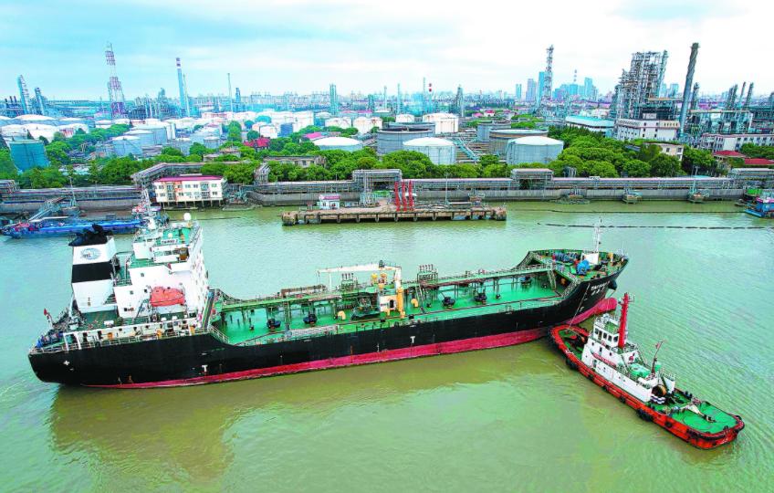 8月28日,泰海3号沥青船装载4800吨优质沥青,驶离高桥石化黄浦江3号码头,开往马来西亚。这是该公司沥青产品首次销往海外。图为泰海3号沥青船停靠码头。