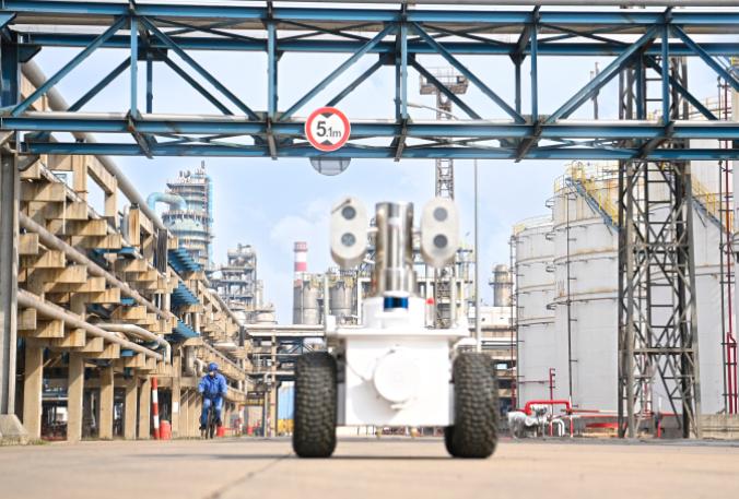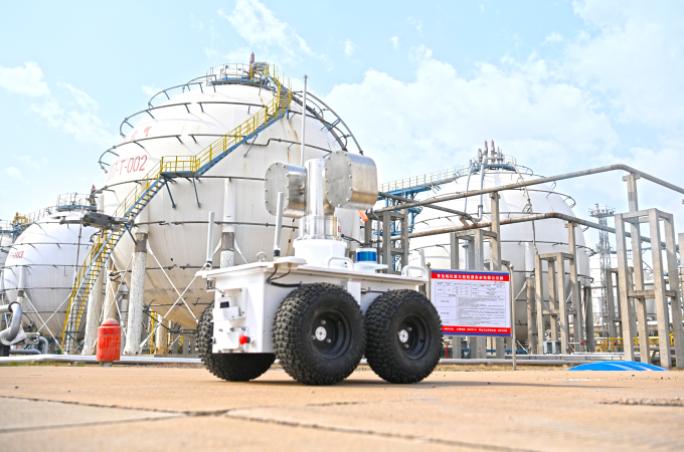 图为青岛炼化智能巡检机器人正在储运罐区进行现场调试工作。