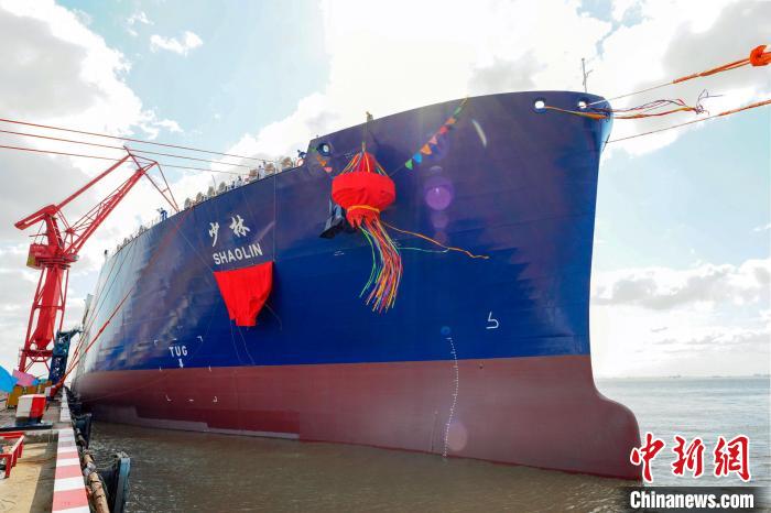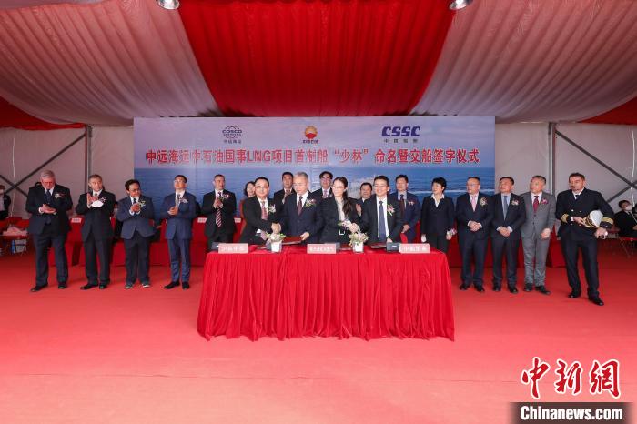 中新网上海10月25日电(殷立勤张文豪)10月25日,中国船舶集团旗下沪东中华(造船)有限公司联合中国船舶工业贸易有限公司,为中远海运中石油国事LNG运输项目建造的6艘17.4万立方米大型液化天然气(LNG)运输船系列首制船“少林”号在中国船舶长兴造船基地命名交付。这是中国船舶集团、中远海运集团、中国石油三家央企同心协力,践行国家能源发展战略贡献的力作,也是沪东中华深耕LNG产业链25年,完工交付的第40艘各类LNG储运船,创造了中国LNG产业链新的里程碑。“少林”号为当今世界主流大型LNG运输船,由沪东中华自主研发设计,总长295米,型宽45米,型深26.25米,航速19.5节,入级美国船级社(ABS)。根据该船的运营航线特点,对船型设计特别做了进一步优化,采用全球最新一代双燃料低速推进动力系统,设计配备先进的环保装置,使日油耗量在百吨以内,而且在燃气模式或燃油模式运行下,其排放均能满足国际海事组织最严格的标准,受到船东好评。