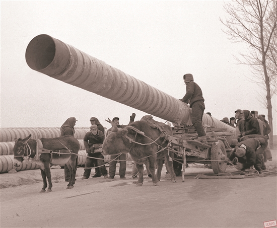 上世纪70年代,为解决运力不足问题,用牛车运送钢管。