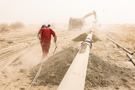 图为石油人顶风冒沙推进管道建设。高屾 王成凯 陈铖 摄影报道